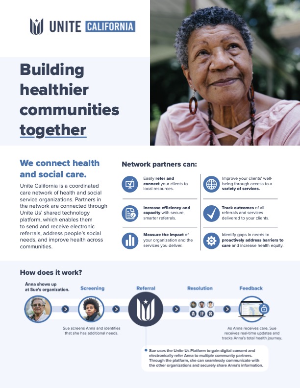 Unite California is a part of the Unite US coordinated care network of health and social service providers. Partners in the network are connected through Unite Us shared technology platform, which enables them to send and receive electronic referrals, address social needs and improve health across communities. Learn how it works by visiting the Unite US website.